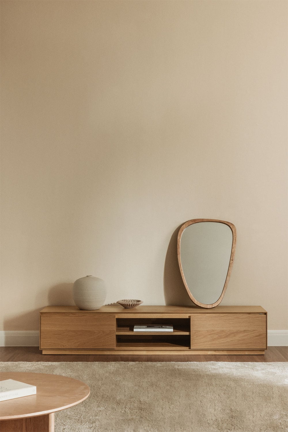 El aparador bajo de madera con espejo orgánico es la pieza clave para transformar tu salón o comedor en un espacio moderno y acogedor. Este mueble funcional, que también puede usarse como mueble TV, combina la calidez de la madera con un toque de diseño contemporáneo, gracias a su espejo de forma orgánica. Ideal para quienes buscan un estilo nórdico y funcional, este aparador ofrece almacenamiento discreto y una superficie elegante para exhibir tus objetos decorativos favoritos.