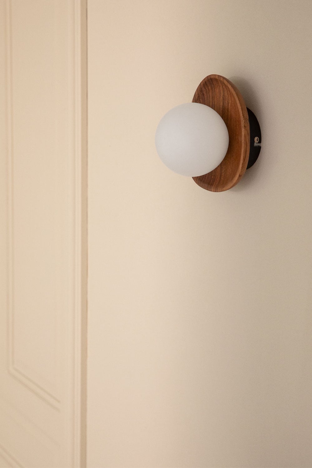 Nuestro aplique destaca por la cuidada selección de sus materiales. La base de madera maciza en tono natural aporta calidez y durabilidad, mientras que el disco metálico negro añade un toque de contraste y sofisticación. La pantalla esférica de cristal blanco opaco difumina la luz, creando una atmósfera relajante y agradable. La combinación de estos elementos garantiza un producto de alta calidad y diseño atemporal. Cada detalle ha sido pensado para ofrecer una experiencia de iluminación excepcional.