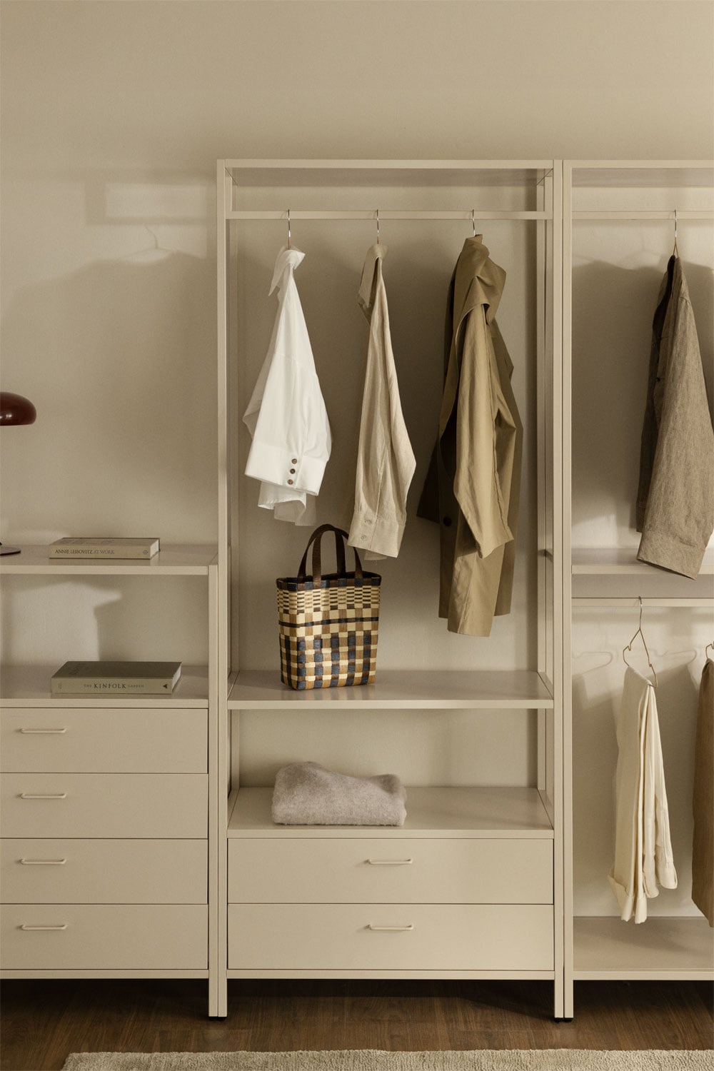 La durabilidad y la estética se dan la mano en nuestro armario abierto. Fabricado predominantemente en acero lacado de alta calidad, presenta un sofisticado acabado mate en un cálido tono beige claro. Este material no solo garantiza una resistencia excepcional y una larga vida útil, sino que también aporta una elegancia sutil a cualquier estancia. Los cajones inferiores integrados están construidos con metal resistente, asegurando un deslizamiento suave y una capacidad de carga óptima para tus pertenencias. Cada detalle ha sido cuidadosamente seleccionado para ofrecer un producto que combina diseño nórdico con la robustez que necesitas.