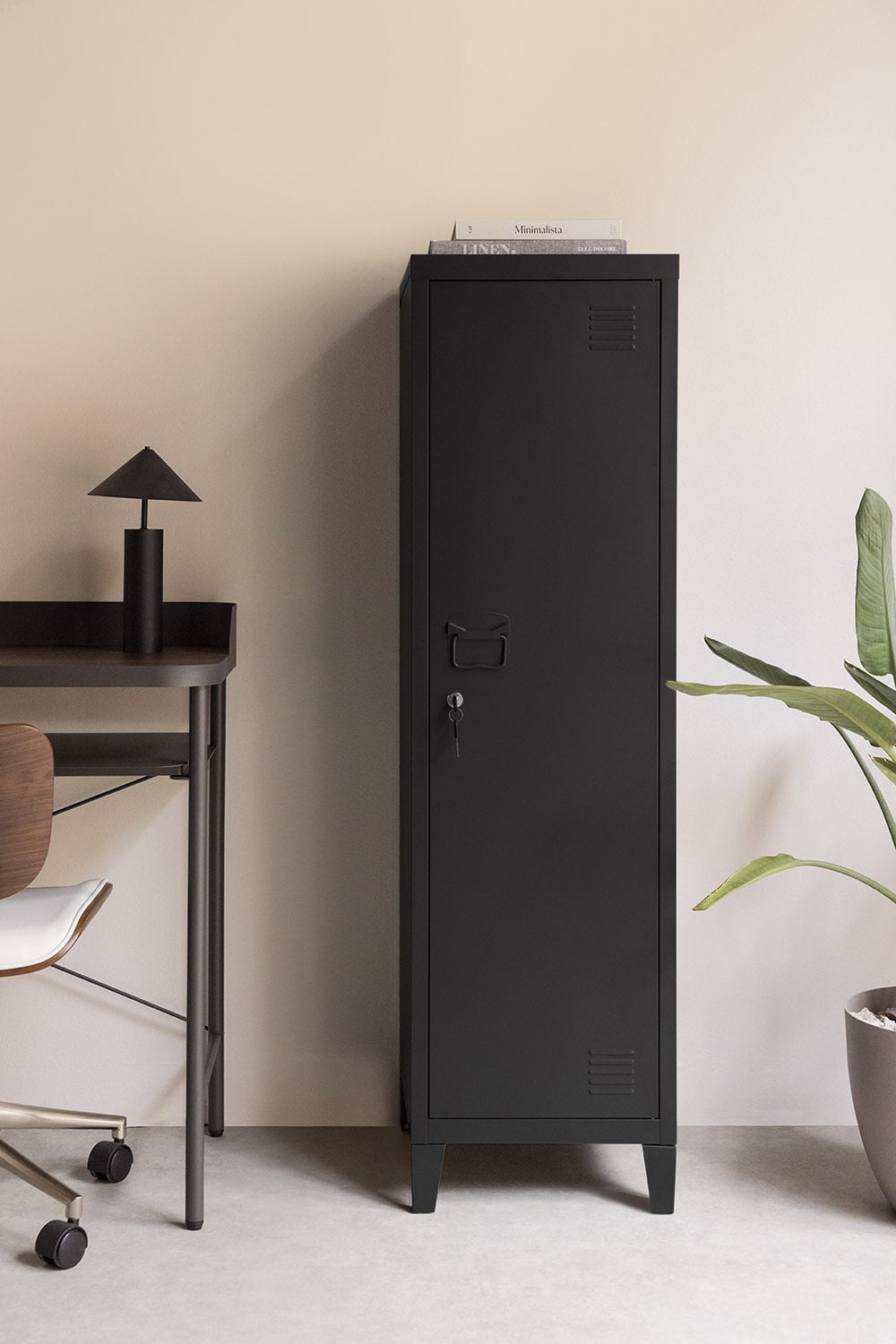El estilo industrial de este armario lo convierte en una pieza central en cualquier espacio. Imagínalo en tu dormitorio, aportando un toque urbano y sofisticado, o en tu oficina, ofreciendo una solución de almacenamiento práctica y con carácter. Incluso en la entrada, este armario metálico puede convertirse en un elemento decorativo funcional, perfecto para guardar abrigos, zapatos y otros objetos esenciales. Combínalo con elementos de madera natural y textiles en tonos neutros para crear un ambiente cálido y equilibrado. Para un look más audaz, úsalo junto a piezas de arte contemporáneo y lámparas con detalles metálicos. Su versatilidad te permite adaptarlo a tu propio estilo personal.