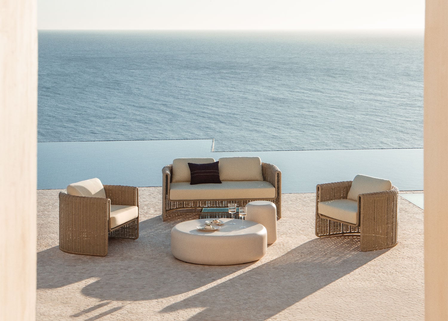 Inspirado en la serena belleza del estilo Mediterráneo, este conjunto invita a la relajación y a la conexión con la naturaleza. La del sofá de dos plazas y los sillones individuales crea un ambiente de , ideal para largas sobremesas o tardes de lectura. Las ofrecen una versatilidad funcional, permitiendo organizar aperitivos, bebidas o elementos decorativos de manera práctica y estética. Su diseño neutro y las texturas orgánicas del mimbre y el cemento permiten una en cualquier entorno, realzando la belleza natural de tu o y sirviendo como base perfecta para añadir toques personales con plantas, textiles y luces.