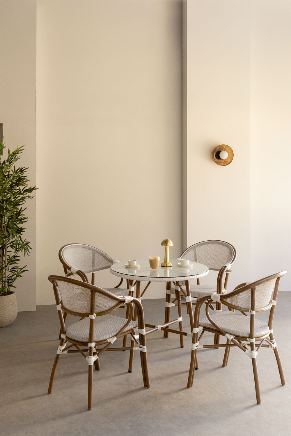 El Conjunto de mesa redonda y 4 sillas Brielle Bistro es la solución ideal para crear un ambiente acogedor y con estilo en tu hogar. Su diseño nórdico y la combinación de materiales naturales lo convierten en una pieza versátil, perfecta tanto para interiores como exteriores. Disfruta de tus desayunos, comidas o cenas en un entorno lleno de encanto y confort. ¡Prepárate para recibir elogios por tu buen gusto!
