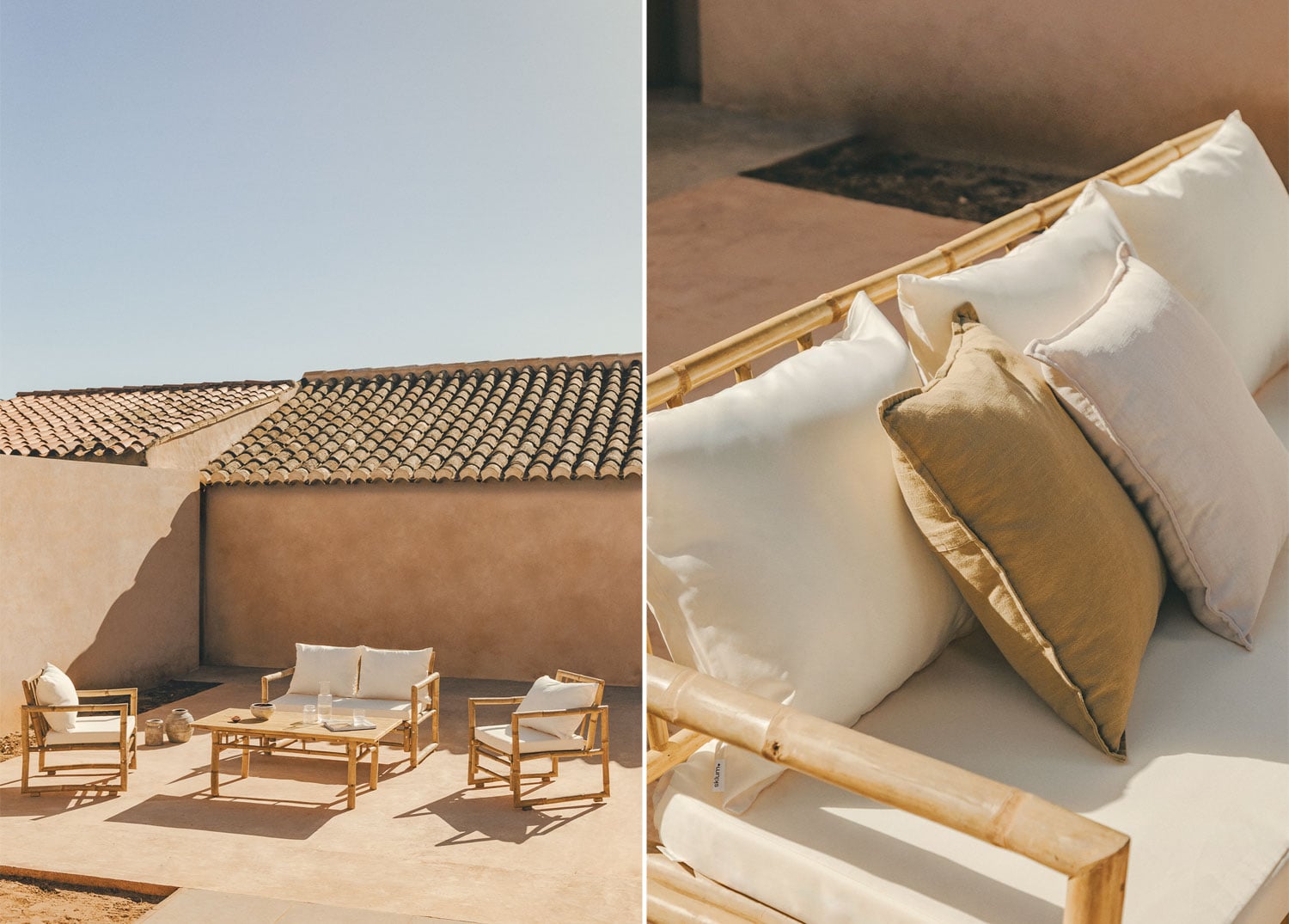 La durabilidad y la estética se unen en este conjunto. Fabricado con bambú de alta calidad, la estructura ofrece resistencia a la intemperie y un acabado natural que se integra perfectamente con el entorno. Los cojines de tela en color blanco, suaves al tacto y fáciles de limpiar, garantizan el máximo confort. El diseño con brazos rectos en los sillones y el sofá, junto con la mesa de centro rectangular, completan un conjunto funcional y elegante. Un sofá para exteriores diseñado para durar y resistir el paso del tiempo.