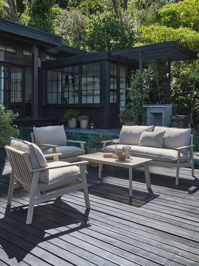 Este conjunto de jardín destaca por la calidad de sus materiales. La estructura de cada pieza está construida en madera clara cuidadosamente seleccionada, que aporta durabilidad y un acabado liso y agradable al tacto. La tela de los cojines, en un suave tono beige, no solo es resistente al uso exterior, sino que también ofrece un confort excepcional. Cada detalle ha sido pensado para garantizar la máxima resistencia y un diseño atemporal que se adapta a cualquier ambiente. La mesa de centro rectangular, con sus características patas inclinadas, complementa a la perfección el conjunto, proporcionando una superficie ideal para aperitivos y bebidas.