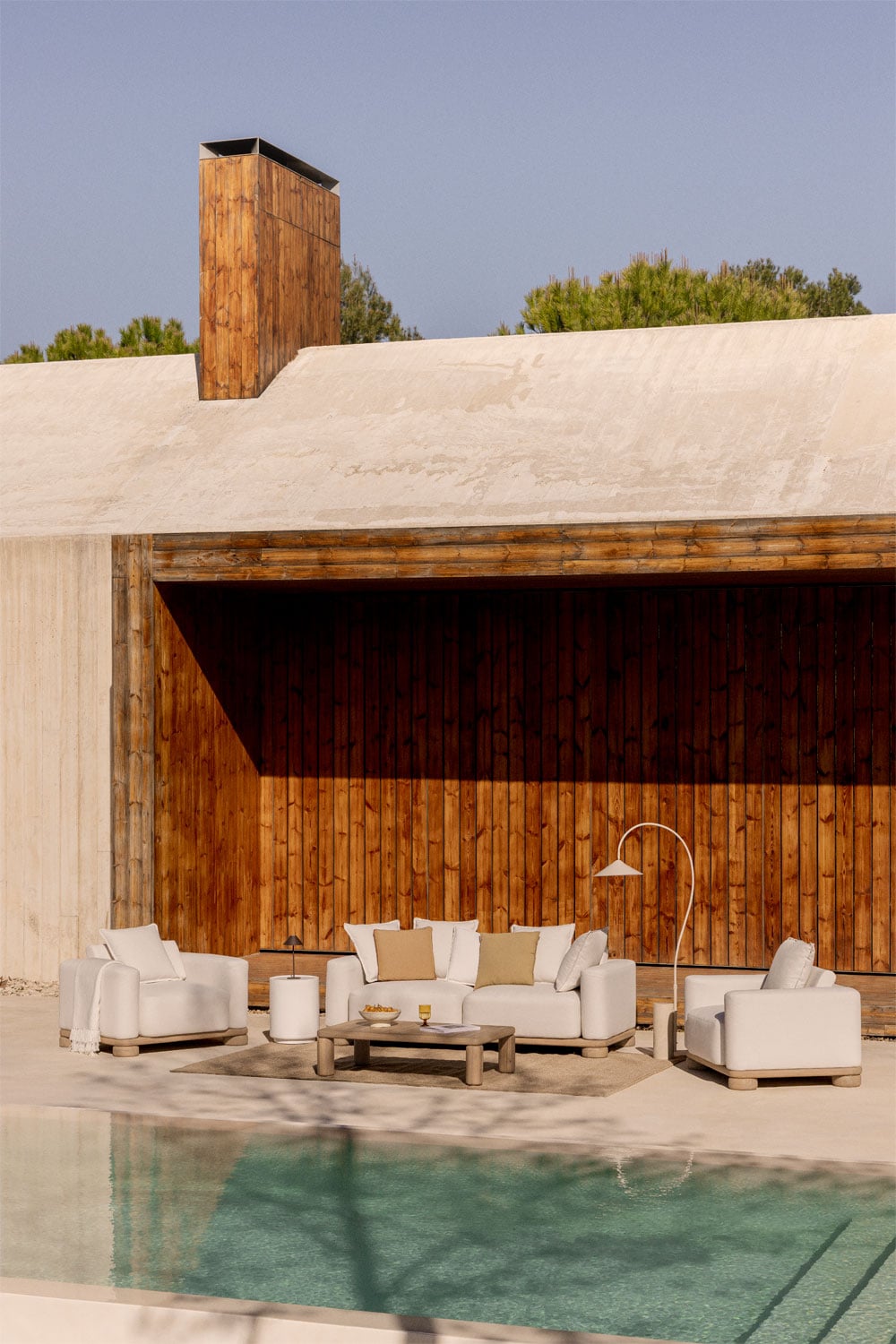 Este conjunto está fabricado con materiales de primera calidad para garantizar su resistencia y longevidad. La estructura de madera vista clara aporta calidez y un toque natural, mientras que la tela de tapicería acolchada en blanco crudo ofrece un confort excepcional. Los cojines decorativos, cuidadosamente seleccionados en tonos neutros, añaden un toque de elegancia y personalización. La combinación de estos materiales crea un ambiente acogedor y sofisticado, perfecto para disfrutar del aire libre.