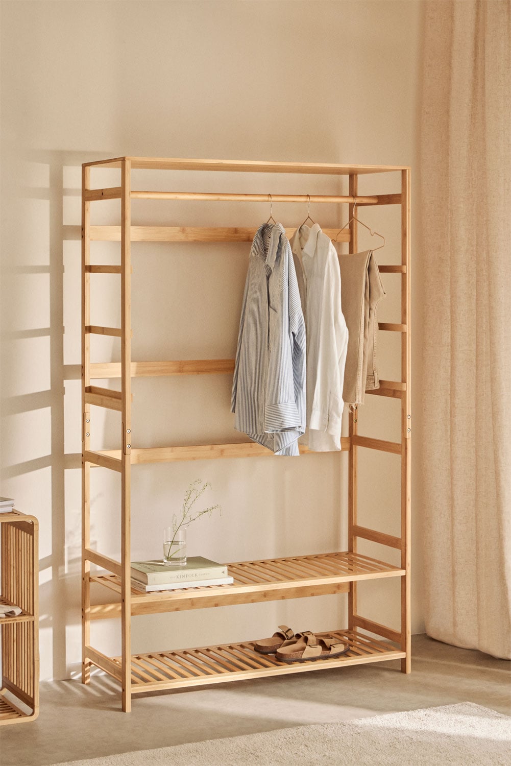 Elaborada en bambú, esta estantería perchero destaca por su durabilidad y resistencia. El bambú, una madera de rápido crecimiento y gran sostenibilidad, aporta un toque natural y cálido a tu hogar. Su estructura robusta, con múltiples baldas horizontales y una barra superior, te permite colgar ropa, guardar zapatos y exhibir tus accesorios favoritos. Los listones verticales que conectan las baldas no solo refuerzan la estructura, sino que también añaden un detalle estético distintivo. Invertir en esta estantería de bambú es apostar por un mueble duradero y respetuoso con el medio ambiente.
