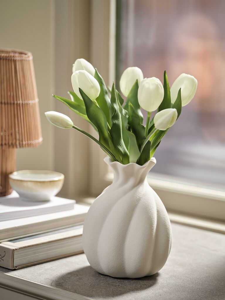 Fabricado en cerámica de alta calidad, este jarrón presenta una durabilidad excepcional. El acabado mate en color blanco uniforme, junto con las ranuras verticales que recorren su cuerpo ovoide, le confieren una textura visualmente atractiva y agradable al tacto. La cerámica, además de ser un material resistente, aporta un toque de calidez y autenticidad a la pieza, garantizando que se mantenga como un elemento decorativo destacado por mucho tiempo. La robustez del material asegura la estabilidad del jarrón, permitiéndote exhibir tus flores favoritas o ramas decorativas con total confianza.