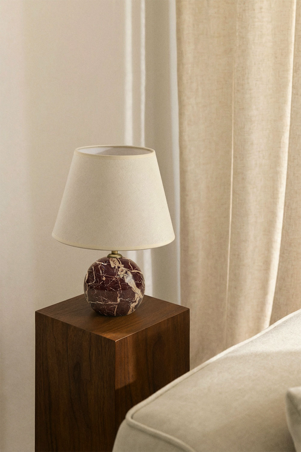 Esta lámpara de mesa destaca por la calidad superior de sus materiales. La base de mármol es el elemento central, con sus patrones veteados únicos en tonos marrón rojizo y beige que aportan un aire de lujo discreto. La pantalla de tela color crema suaviza la luz, creando una iluminación ambiental agradable y relajante. Los detalles en metal dorado y el pedestal de madera oscura con acabado brillante, suman elegancia y robustez a la pieza. Cada componente ha sido seleccionado cuidadosamente para garantizar durabilidad y un acabado impecable.