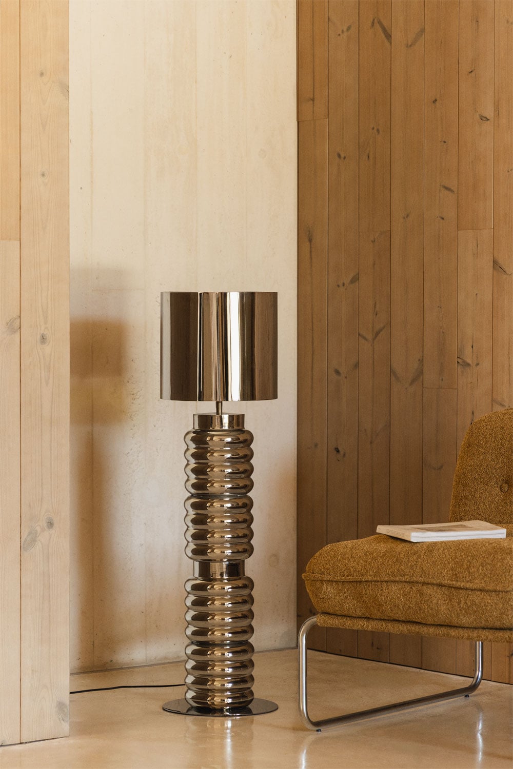 Esta lámpara de pie encaja a la perfección con decoraciones de estilo moderno, pero su versatilidad permite integrarla en otros ambientes. Imagina esta lámpara plateada junto a un sofá de terciopelo en un salón de estilo glam, o como un contrapunto elegante en un dormitorio minimalista. Su diseño sutil pero impactante la convierte en un elemento clave para expresar tu personalidad. Combínala con otros elementos metálicos para un look cohesionado, o úsala para añadir un toque de brillo a espacios más sobrios. Su luz suave y elegante realzará cualquier rincón de tu hogar.