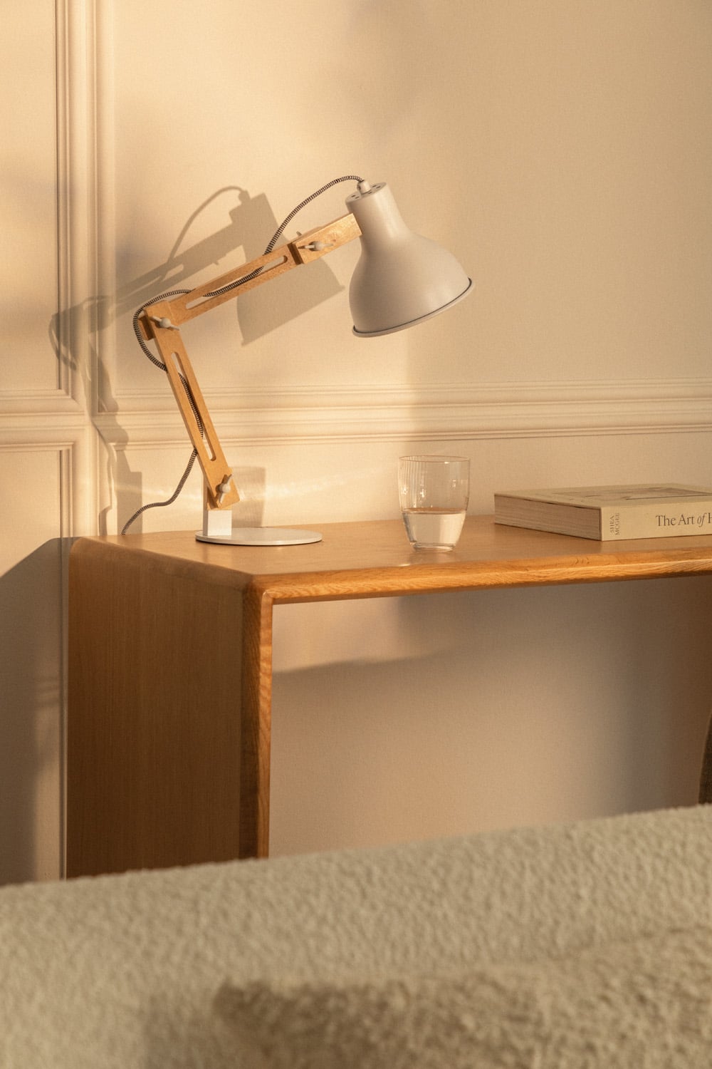 Elaborada con materiales de primera calidad, esta lámpara de escritorio destaca por su durabilidad y diseño funcional. Su brazo articulado, compuesto por elementos de madera clara y herrajes metálicos resistentes, te permite dirigir la luz exactamente donde la necesitas. La base circular plana blanca garantiza una estabilidad perfecta, mientras que la pantalla cónica, en un elegante gris claro con borde plateado, difunde una luz suave y agradable. El detalle del cable textil trenzado en blanco y negro añade un toque de sofisticación que marca la diferencia.