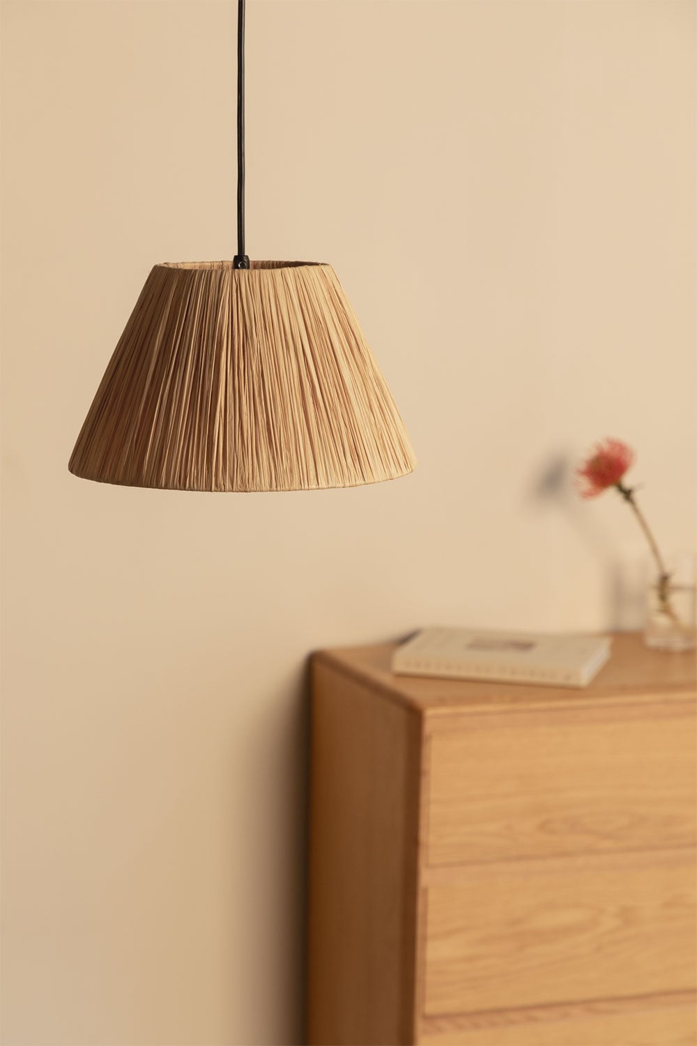 La lámpara Aruel es un testimonio de la calidad artesanal. Su pantalla principal, elaborada con rafia natural seleccionada, presenta un acabado texturizado de plisados verticales finos que capturan la luz de manera excepcional, proyectando sombras suaves y cálidas. La estructura interna, fabricada con metal resistente, garantiza su durabilidad y estabilidad, mientras que el cable textil negro añade un toque de elegancia contemporánea. El resultado es una pieza que no solo decora, sino que también perdura, ofreciendo una durabilidad excepcional y un diseño atemporal.