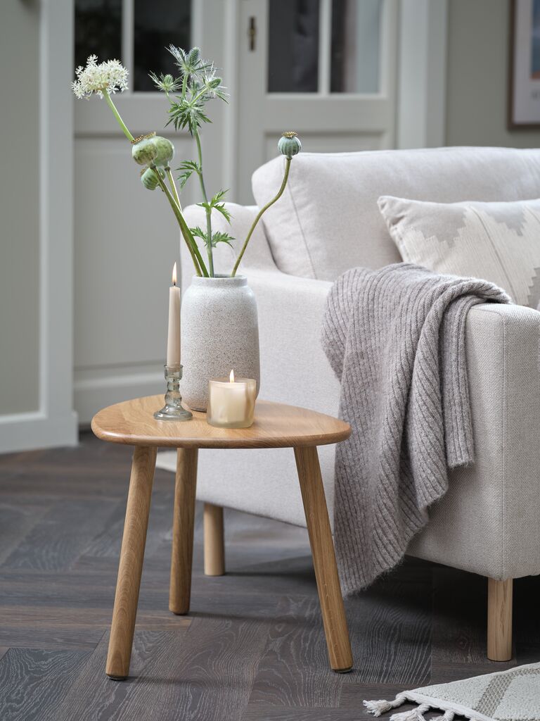 La mesa auxiliar VILDBJERG destaca por la selección de sus materiales. Fabricada en madera de alta calidad, presenta una superficie en color roble cálido que aporta luminosidad y calidez al ambiente. La estructura de tres patas cilíndricas, del mismo tono que la superficie, garantiza una estabilidad óptima. El acabado liso y mate realza la belleza natural de la madera, ofreciendo un tacto suave y agradable. Cada detalle ha sido cuidadosamente considerado para asegurar durabilidad y resistencia, convirtiendo a esta mesa auxiliar en una inversión a largo plazo.