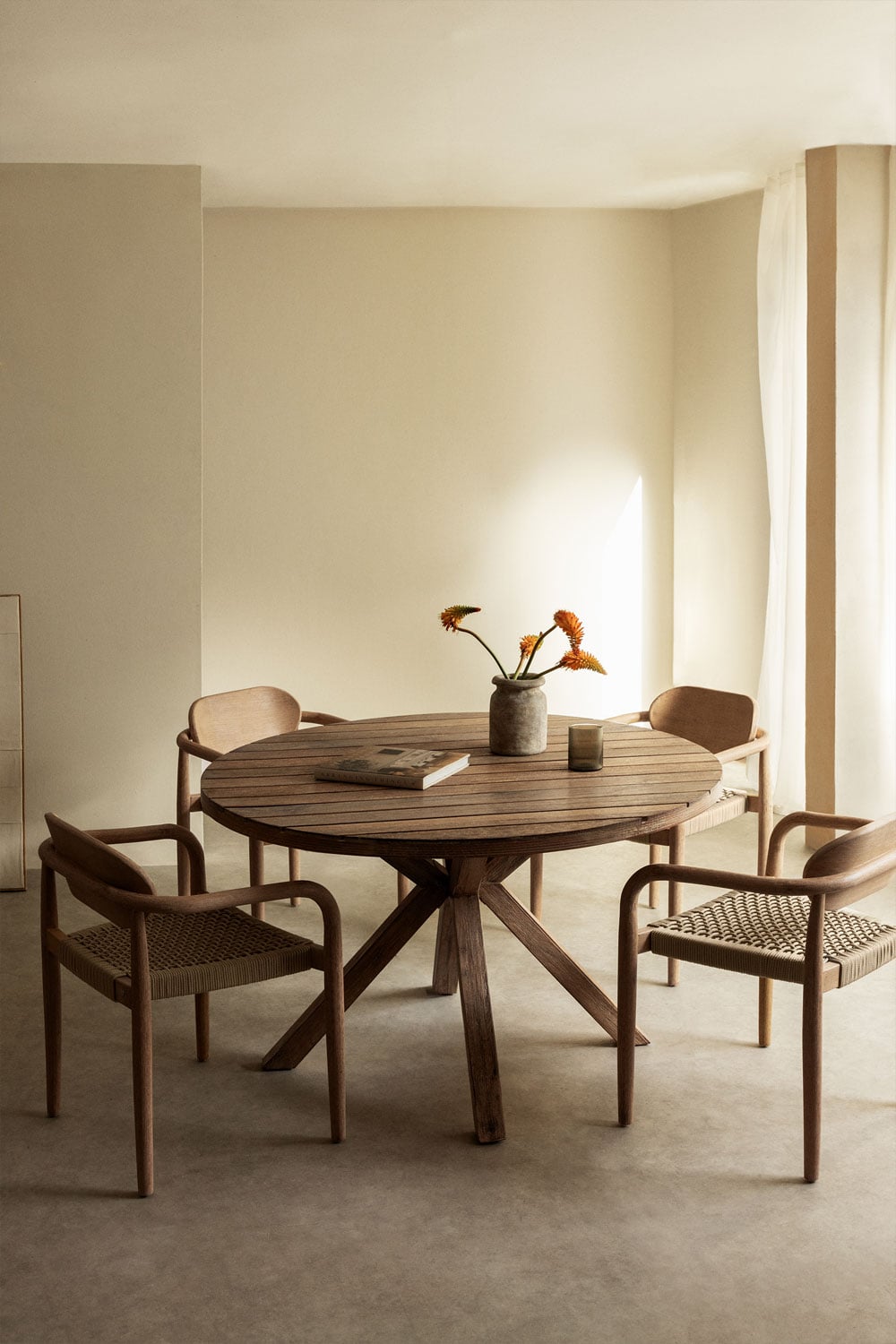 El estilo rústico de esta mesa de comedor la convierte en una opción versátil para una variedad de decoraciones. Puedes combinarla con sillas de diferentes estilos, desde opciones clásicas de madera hasta diseños más modernos y tapizados. Para un ambiente rústico completo, acompáñala con elementos naturales como plantas, textiles de lino y vajilla de cerámica. Si prefieres un contraste interesante, combínala con elementos metálicos y colores neutros para un look más contemporáneo. Deja volar tu imaginación y crea un espacio único y personal con esta mesa de comedor redonda de madera.