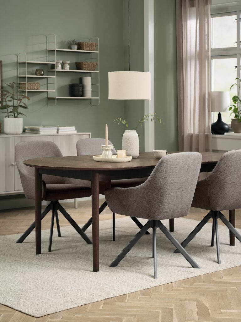 El diseño nórdico de este conjunto de comedor te permite crear un espacio luminoso y funcional. La forma redonda de la mesa fomenta la conversación y la cercanía entre los comensales. El color roble oscuro de la mesa y el gris arena de las sillas son neutros y fáciles de combinar con otros elementos decorativos. Puedes añadir una alfombra de yute para dar calidez al espacio, o jugar con accesorios en tonos pastel para un toque más suave. Este conjunto es perfecto para quienes buscan un estilo minimalista y funcional, sin renunciar a la elegancia y la comodidad. Anímate a experimentar y crea un comedor que refleje tu personalidad.