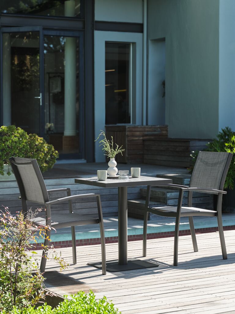 Este conjunto de mesa y sillas de exterior está fabricado con materiales de alta calidad para garantizar su durabilidad y resistencia a la intemperie. La estructura de metal robusta asegura la estabilidad del conjunto, mientras que la tela tensada de los respaldos ofrece un confort excepcional. El color gris oscuro, además de ser elegante, es fácil de combinar y mantener, haciendo de este conjunto una inversión inteligente para tu hogar. Disfruta de la tranquilidad de un producto diseñado para durar.