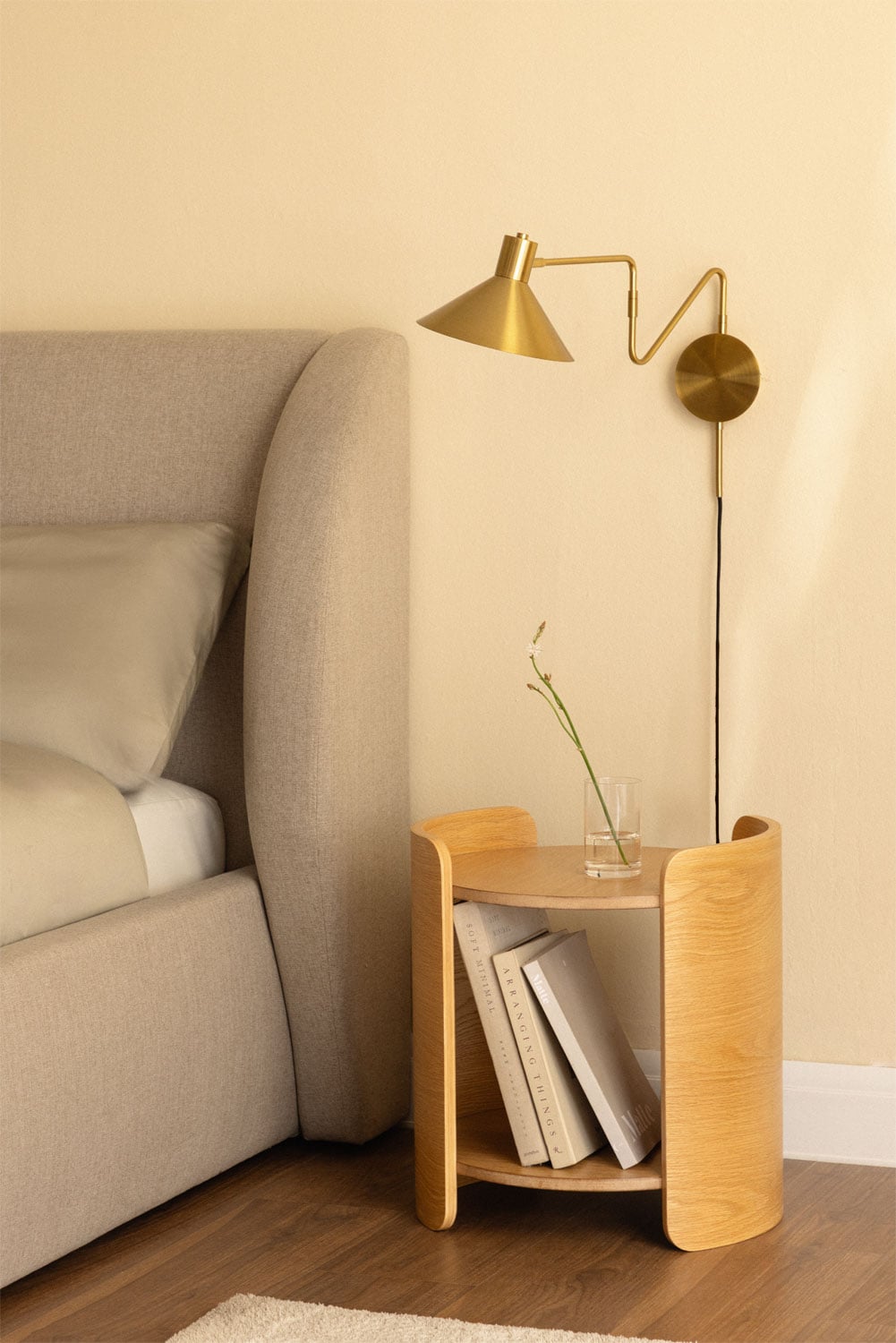 Nuestra mesita de noche destaca por la cuidadosa selección de sus materiales. Fabricada íntegramente en madera de alta calidad, su estructura cilíndrica y su acabado en tono madera clara aportan un aire natural y luminoso a tu dormitorio. La superficie superior lisa proporciona un espacio ideal para colocar una lámpara, un libro o tu teléfono móvil, mientras que el estante inferior te permite guardar revistas, libros o cualquier otro objeto que quieras tener a mano. La robustez de la madera garantiza la durabilidad de esta pieza, convirtiéndola en una inversión inteligente para tu hogar.