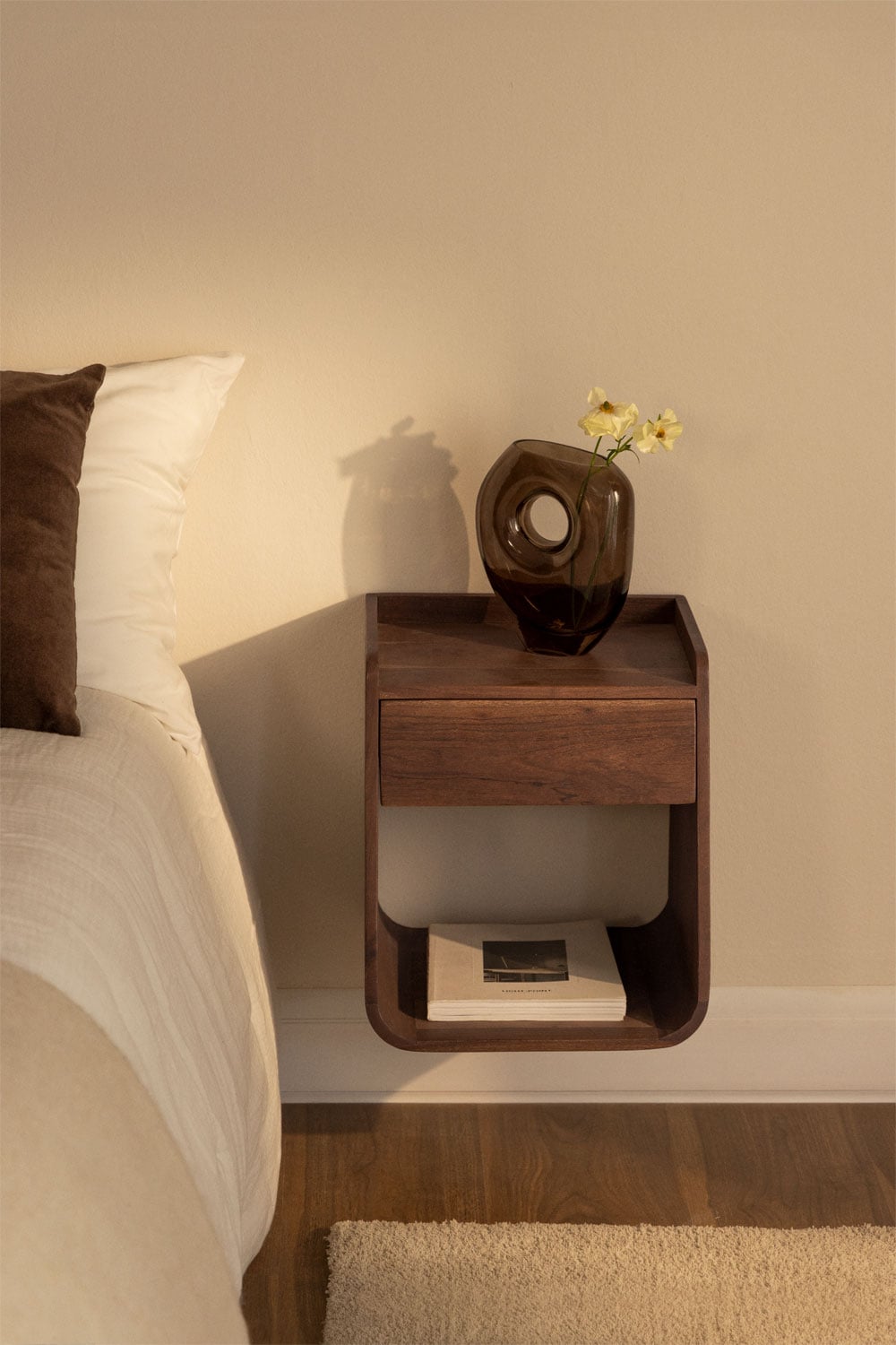 El estilo Orgánico moderno se manifiesta en cada detalle de esta mesita de noche. La ausencia de tiradores visibles y su estructura monobloque que se suspende de la pared refuerzan su carácter minimalista y limpio. El cajón integrado en la parte superior ofrece un espacio discreto para tus objetos personales, mientras que el compartimento inferior abierto es ideal para tener a mano tus libros de lectura o elementos decorativos. Su diseño versátil permite con otros muebles, desde piezas rústicas hasta las más contemporáneas, creando un ambiente en tu dormitorio.