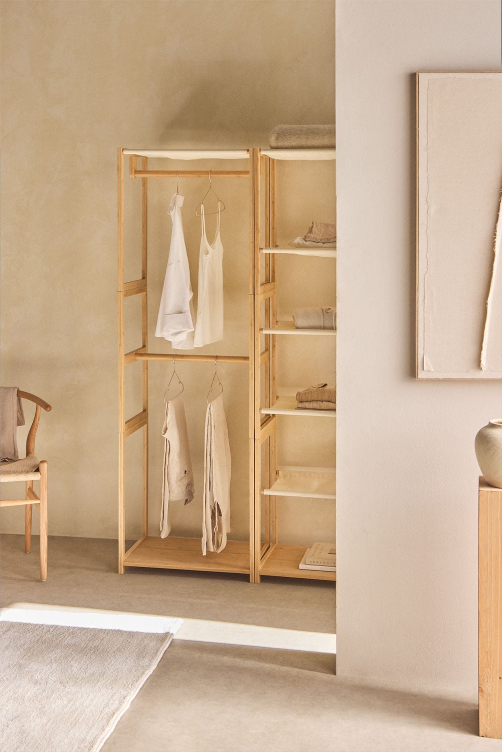El diseño minimalista y rectangular de este perchero abierto se inspira en la naturaleza y la simplicidad funcional. Su silueta limpia y sus líneas rectas lo convierten en una pieza versátil, fácil de integrar en diversos estilos decorativos. Combina a la perfección con ambientes , , o simplemente para añadir un toque orgánico a decoraciones más modernas. Utiliza las barras para colgar tus prendas favoritas y los estantes de tela para organizar tus zapatos, bolsos o cajas de almacenamiento. Este perchero no es solo un mueble, es una declaración de intenciones: , y .