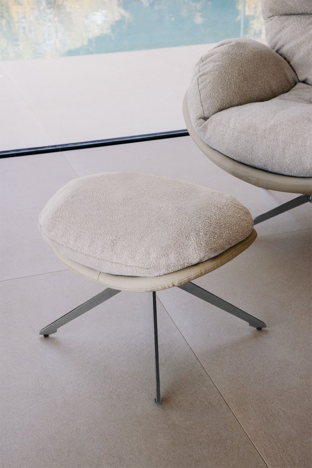 La excelencia de nuestro reposapiés giratorio Amanda reside en la cuidada selección de sus materiales. El tapizado superior, un mullido cojín abullonado, está confeccionado en una exquisita tela bouclé de un cálido color beige claro, ofreciendo una textura suave y envolvente al tacto. La base estructural, en un elegante acabado que simula cuero en un tono beige ligeramente más oscuro, aporta contraste y durabilidad. Todo ello se sustenta sobre una robusta estructura de metal de cuatro patas delgadas y anguladas, con un sofisticado acabado plateado o gris, garantizando estabilidad y un diseño ligero y moderno.