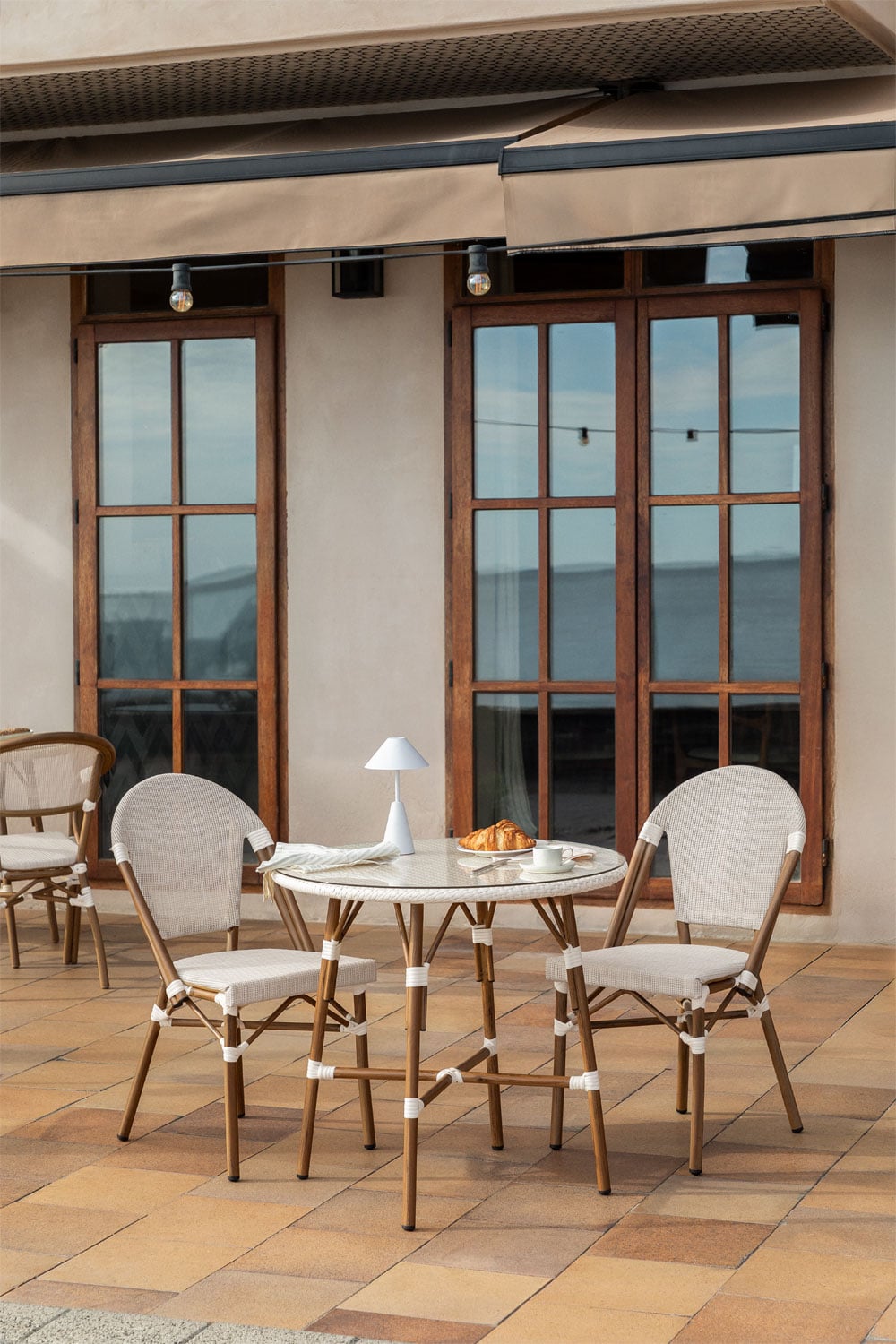 El set Brielle Bistro destaca por la selección de sus materiales de alta calidad. La mesa cuenta con una resistente superficie de cristal apoyada en una estructura de aluminio con un elegante acabado color madera. Los detalles decorativos en cuerda sintética blanca añaden un toque de sofisticación y encanto. Las sillas apilables, fabricadas con la misma estructura de aluminio, incorporan un cómodo asiento y respaldo de ratán sintético en color crema, resistente a las inclemencias del tiempo y fácil de limpiar. La combinación de estos materiales garantiza un producto duradero y de fácil mantenimiento.