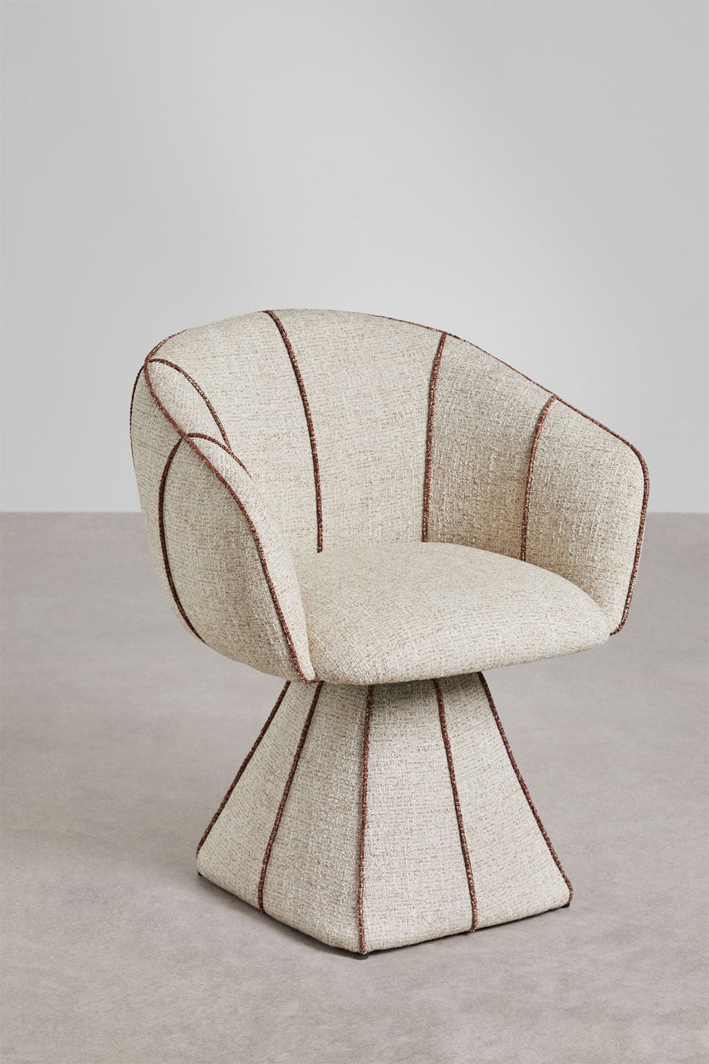 La Silla de Comedor Giratoria Tapizada Beige Tallin ha sido confeccionada pensando en la durabilidad y el confort. Su asiento y respaldo tapizados en una suave y resistente tela beige claro invitan a largas sobremesas. La estructura facetada y envolvente no solo aporta un carácter visual único, sino que también garantiza un soporte ergonómico. La base giratoria tipo pedestal trapezoidal, igualmente tapizada, no solo facilita la movilidad y el acceso, sino que también añade una nota de estilo moderno. El sutil ribete fino en color marrón rojizo que recorre las líneas verticales y el contorno de la silla añade un detalle de acabado artesanal y una definición elegante.