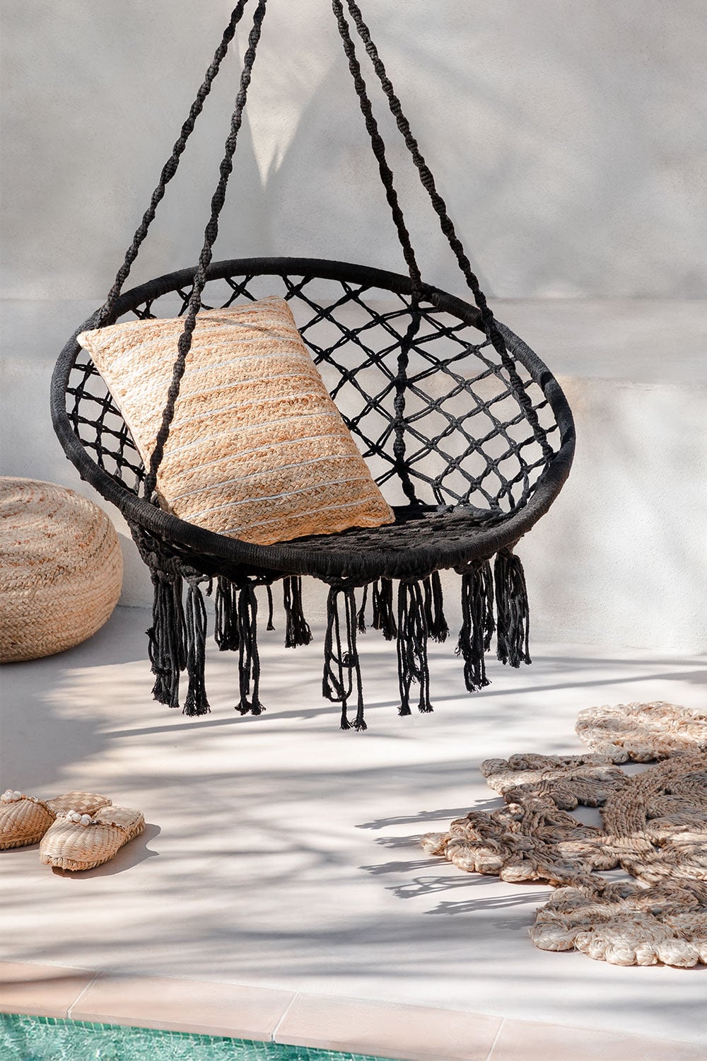 El estilo boho de este sillón colgante lo convierte en una pieza versátil que se adapta a diversos ambientes. Puedes combinarlo con elementos naturales como plantas y madera para potenciar su encanto rústico. Si prefieres un look más moderno, intégralo en espacios con líneas limpias y colores neutros. El contraste del negro con el beige del cojín permite jugar con diferentes paletas de color en tu decoración. Deja volar tu imaginación y crea un espacio único que refleje tu personalidad. Este sillón colgante es la pieza clave para un ambiente relajado y con estilo.