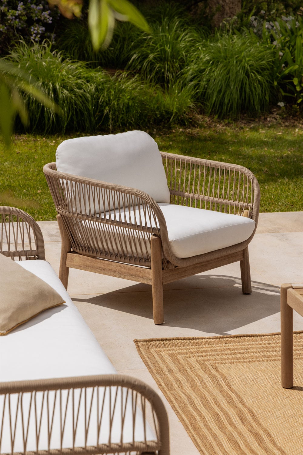 Este sillón ha sido fabricado con materiales de primera calidad para garantizar su durabilidad y resistencia a las condiciones climáticas. La estructura de madera clara, cuidadosamente seleccionada, aporta solidez y un toque natural al conjunto. Los cojines tapizados en tela blanca, suaves al tacto, ofrecen una comodidad excepcional. La cuerda trenzada beige, elemento distintivo de este diseño, no solo aporta un toque estético único, sino que también contribuye a la ventilación y frescura del sillón. Cada detalle ha sido pensado para crear una pieza de mobiliario que te acompañará durante mucho tiempo.