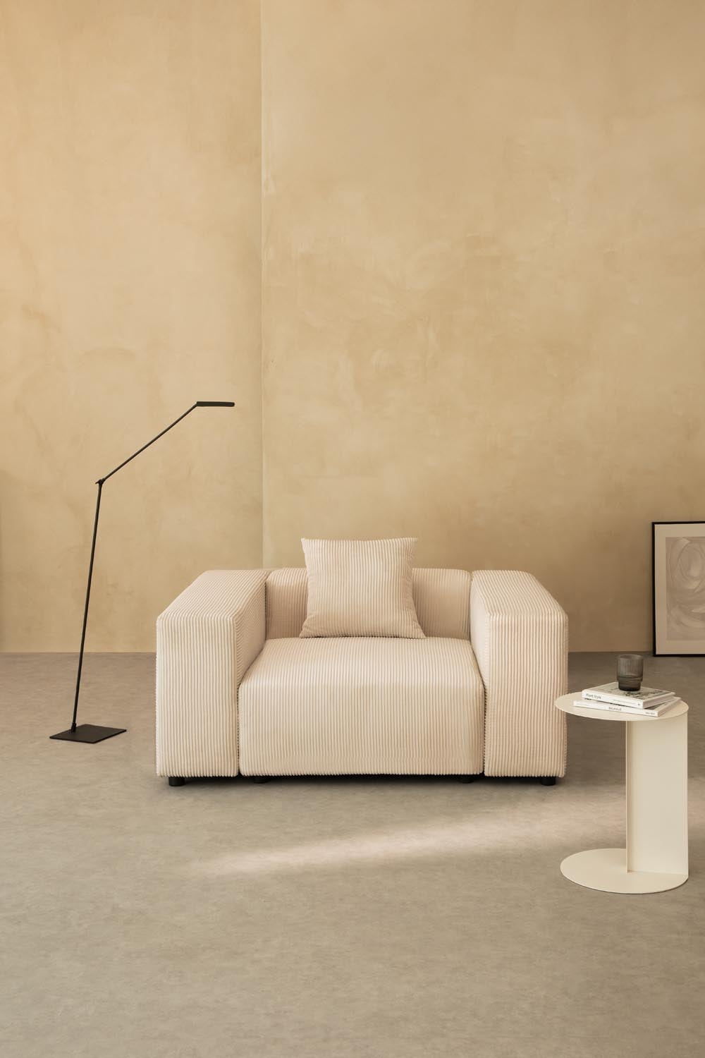 Nuestro sillón modular está fabricado con materiales de primera calidad para garantizar su durabilidad y confort. La estructura de madera proporciona una base sólida y resistente, mientras que el tapizado en tela de pana ofrece una textura suave y agradable al tacto. El patrón vertical de la pana añade un toque de sofisticación y elegancia. La elección del color beige uniforme asegura su fácil integración en cualquier paleta de colores existente en tu hogar. Cada detalle ha sido cuidadosamente seleccionado para ofrecer un producto de alta calidad que te acompañará durante muchos años.