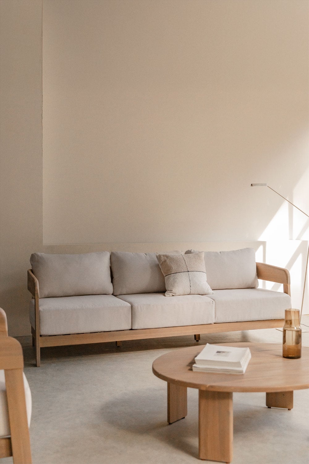 El Sofá Uleno destaca por su robusta estructura de madera de acacia, conocida por su durabilidad y belleza natural. El acabado natural de la madera clara aporta un toque de calidez y luminosidad a cualquier espacio. El tapizado en tela beige claro de alta calidad ofrece un tacto suave y agradable, invitando al descanso. Los cojines del asiento, rectangulares y planos, proporcionan una comodidad excepcional, mientras que los brazos curvados añaden un toque de sofisticación al diseño general. Las patas cortas de madera elevan ligeramente la base, facilitando la limpieza y aportando ligereza visual.