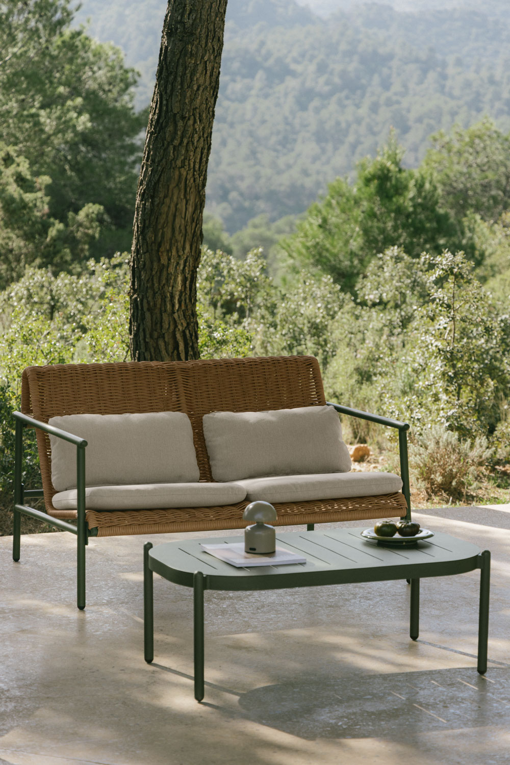 La estructura de ratán color marrón claro de este sofá no solo le confiere un aspecto elegante y natural, sino que también garantiza su durabilidad y resistencia a las inclemencias del tiempo. El trenzado del respaldo y asiento proporciona una comodidad excepcional. La estructura metálica tubular en color verde oliva añade un toque moderno y robusto, asegurando la estabilidad del sofá. Los cojines rectangulares tapizados en tela color beige claro ofrecen un extra de confort y suavidad, complementando a la perfección el diseño general. La combinación de estos materiales de alta calidad asegura que disfrutarás de este sofá durante muchos años.