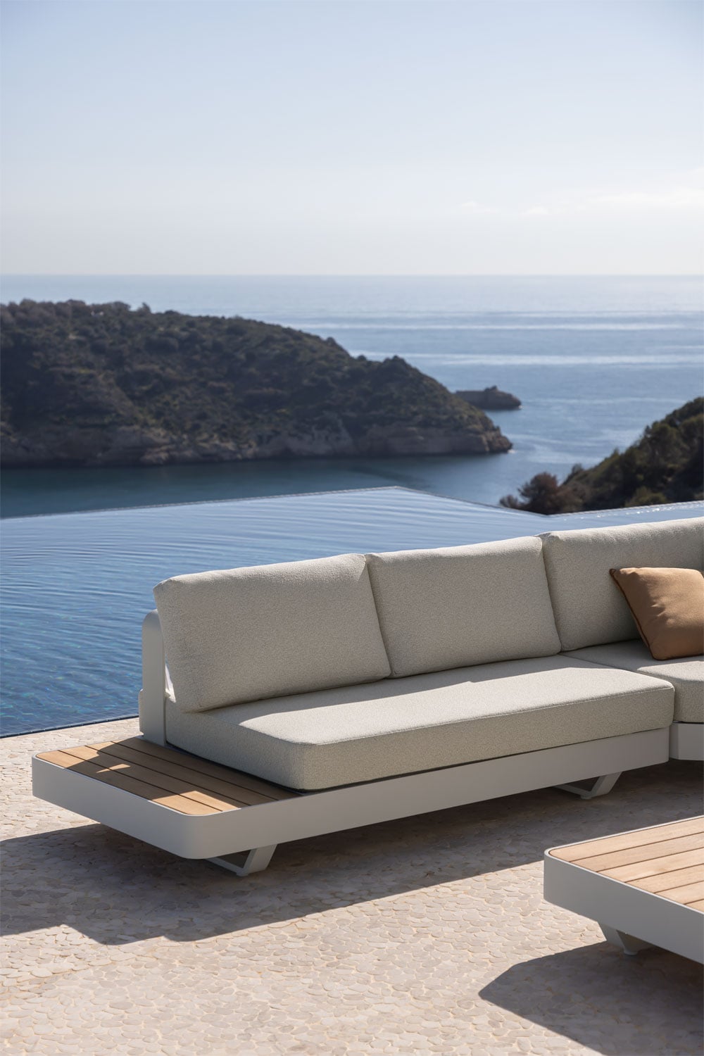 La excelencia en la fabricación es nuestro sello distintivo. El Sofá Yarilo cuenta con una robusta estructura de aluminio de perfil bajo y acabado claro, garantizando resistencia a la intemperie y una ligereza sorprendente. Integrada en su diseño, una plataforma auxiliar elaborada con madera de teca natural aporta calidez y un toque orgánico, ideal para colocar tus bebidas o elementos decorativos. Los voluminosos cojines del asiento y respaldo están tapizados en un tejido técnico de alta durabilidad en un sofisticado color beige, ofreciendo un confort excepcional y una fácil limpieza.