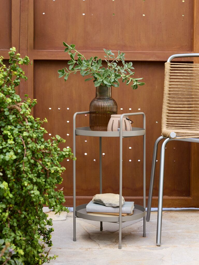 El soporte HAVLIRE está fabricado con metal resistente, garantizando su durabilidad y estabilidad. Su acabado superficial liso en color gris arena le confiere un aspecto sofisticado y actual, integrándose fácilmente en cualquier decoración. La estructura tubular y las dos bandejas circulares unidas por soportes verticales crean un diseño geométrico que aporta un toque de modernidad a tu espacio. Su robustez permite colocar objetos decorativos, plantas o incluso utilizarlo como apoyo para bebidas y aperitivos.